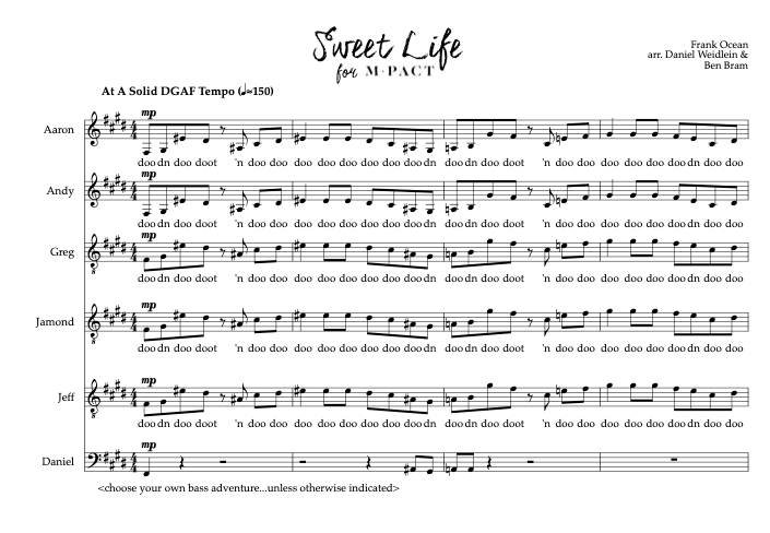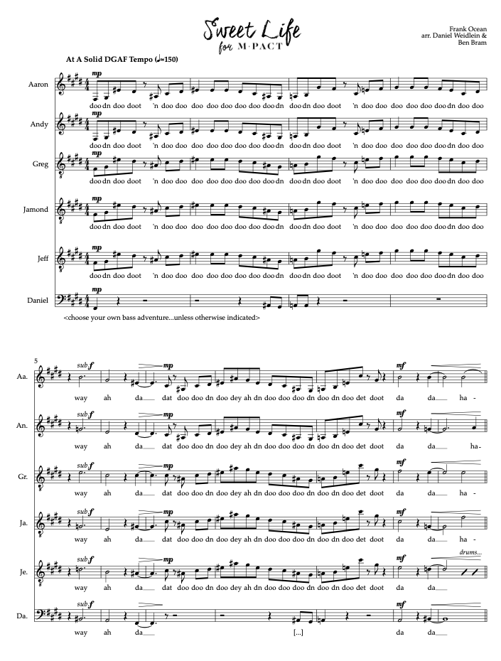 Sheet Music By M·PACT Click on the music for sample recordings and more information Categories: Select a Category Favorites New Standard Repertoire Holiday New Favorites New Standard Repertoire Holiday Spain $100.00 Add To Cart Added! Sweet Life $125.00 Add To Cart Added!